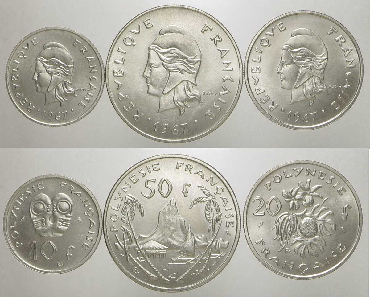 116. POLINESIA FRANCESE. Colonia francese. 50, 20 e 10 franchi 1967. Serie di tre esemplari. KM.7/6/5. FdC...€.25,00.