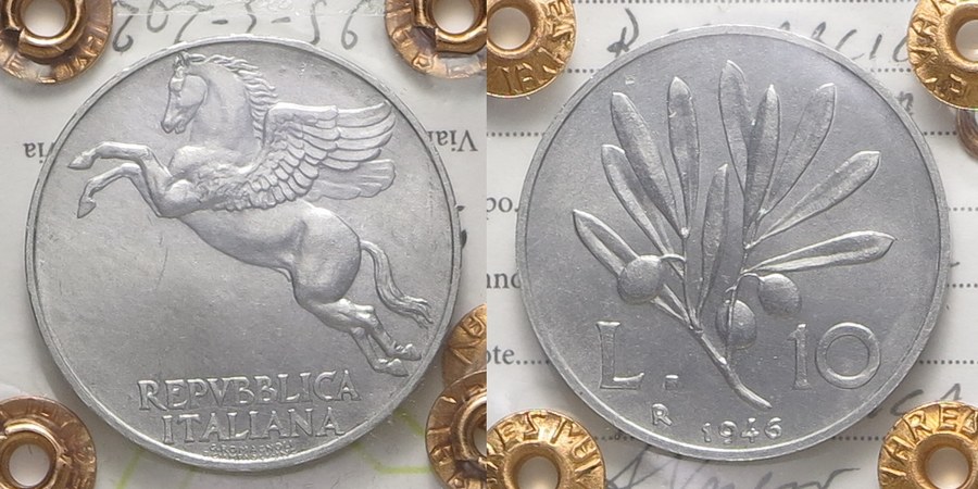 4. ITALIA. Repubblica 10, 5, 2 e 1 lira 1946 (serie completa di quattro esemplari). Immagini: 10 lire - 5 lire - 2 lire - 1 lira. P.2301, 2351, 2401 e 2451. Le 10 lire SPL, le 5 lire BB+, le 2 lire BB, la lira q.SPL. (sigillature e conservazioni di A. Varesi)...R.€.690,00.