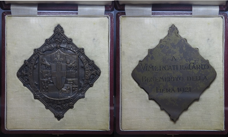 76.. --. Fiera Campionaria Internazionale. Placchetta 1921 in AE mm.113x98 con dedica al R/. “ A VIMERCATI RAG. CARLO BENEMERITO DELLA FIERA 1921”. Opus: ?. FdC, in astuccio originale...€.100,00.