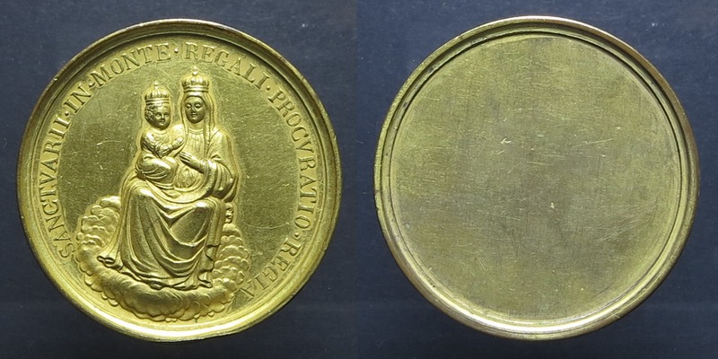 31. --. Medaglia uniface s.d. in AE dorato mm.40 (per il Santuario-Basilica Regina Montis Regalis – Santuario di Vicoforte, Cuneo). Opus: Veglia (?). SPL, fondi lucidati, al D/. colpetti sui bordi...€.45,00.