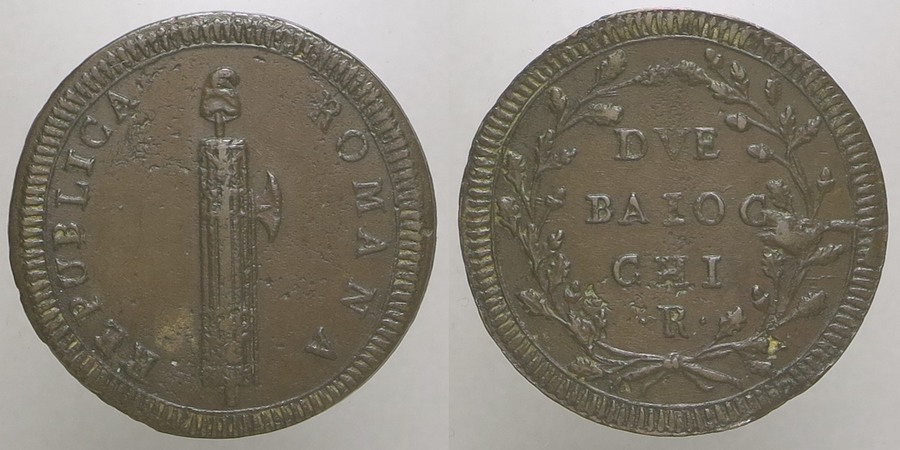 10. ROMA. Repubblica romana. Due baiocchi s.d. (R al R/.). P.33b. Bruni 31 (R). Peso gr.14,04. Buon BB, piacevole colorazione cuoio...€.65,00.