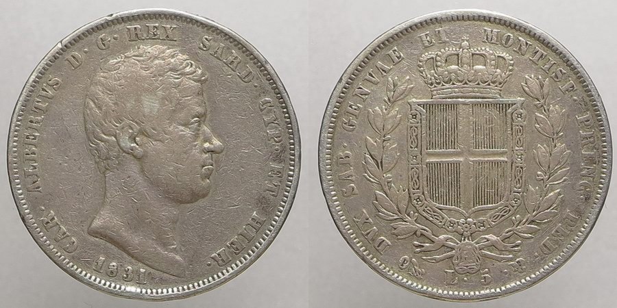 11. SAVOIA. Carlo Alberto (1831-49). 5 lire 1831-G (croce sottile). P.229a. MB, piacevole patina.........RR.€.210,00.