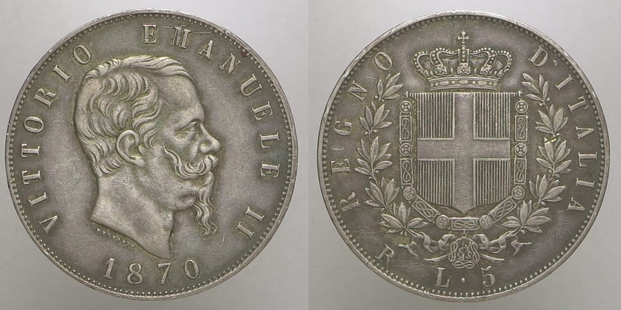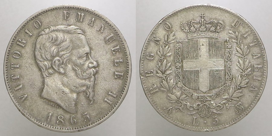 12. SAVOIA. Vittorio Emanuele II (1861-78). 5 lire 1865 Napoli. P.486. q.BB, graffietti nei campi, lievissimi colpetti sui bordi...R.€.75,00.