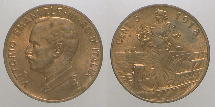 16. SAVOIA. Vittorio Emanuele III. 5 centesimi 1918. P.897. FdC, rame rosso...€.35,00.