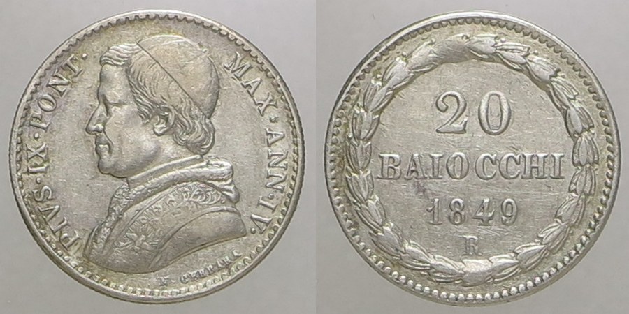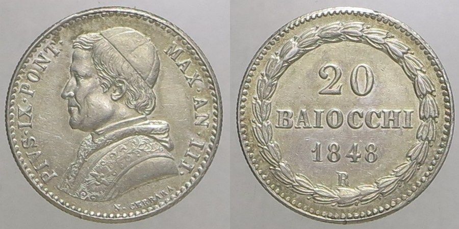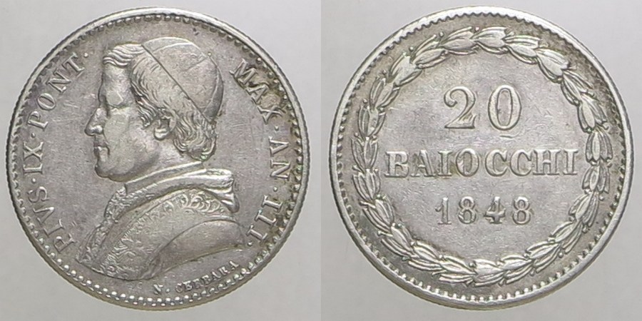 26. ROMA. Pio IX. 20 baiocchi 1848-III. P.316. SPL, impercettibile colpetto sul bordo, fondi lucenti...R.€.70,00.