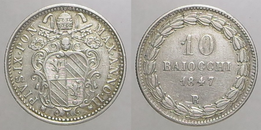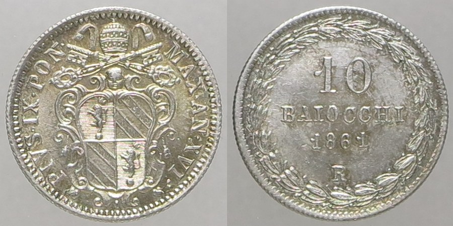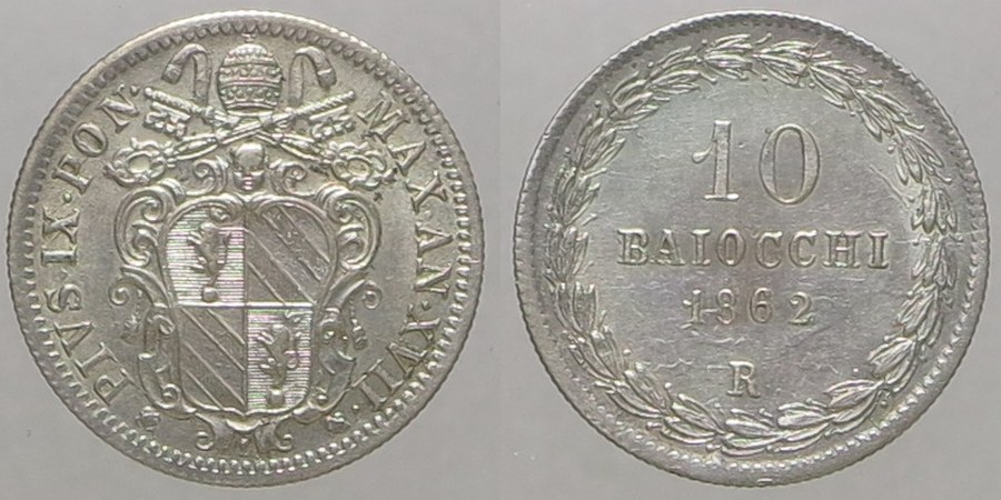 80. ROMA. Pio IX. 10 baiocchi 1862-XVII. P.445. SPL, fondi lucenti...€.50,00.