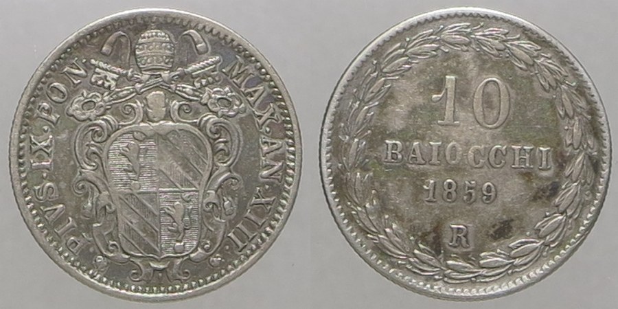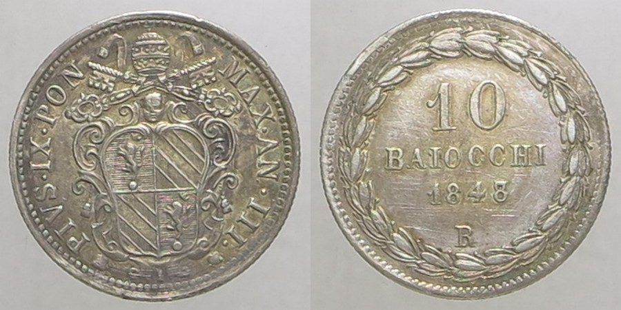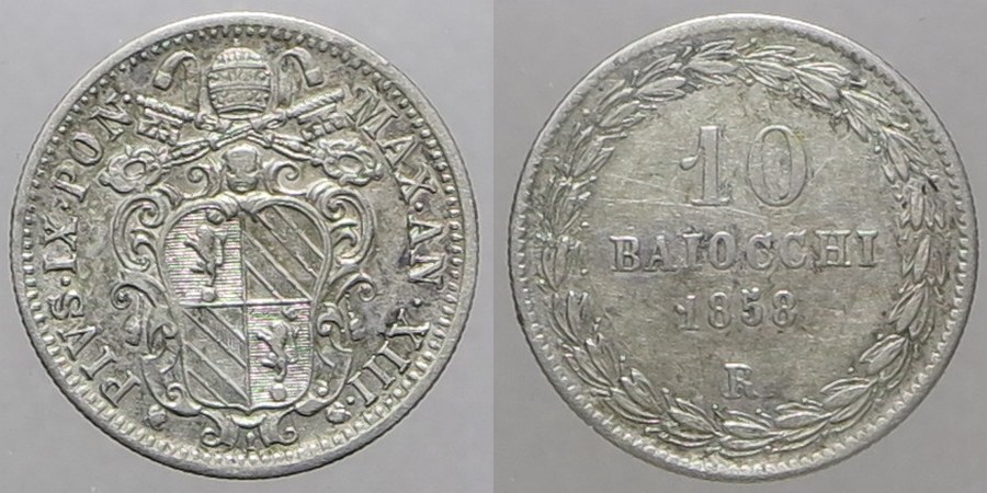 76. ROMA. Pio IX. 10 baiocchi 1858-XII. P.438. Ottimo BB/q.SPL, fondi in parte lucenti...€.35,00.