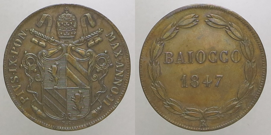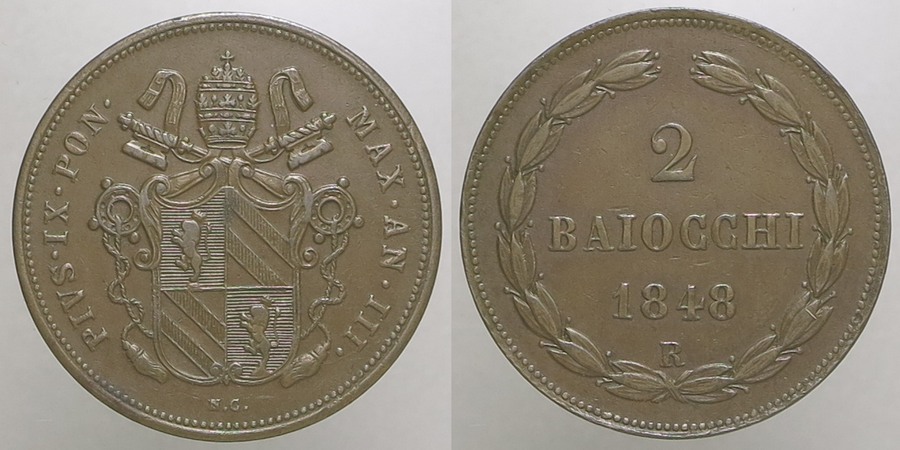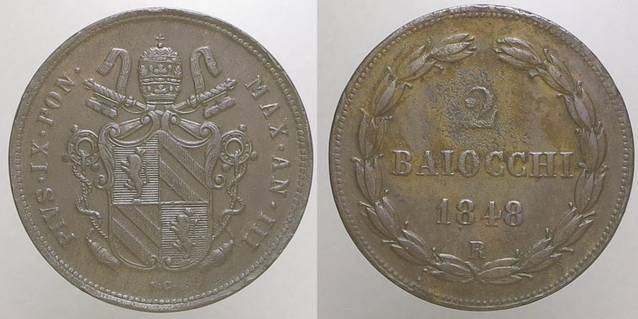 31. ROMA. Pio IX. 2 baiocchi 1848-III. P.325a. q.SPL, lievi colpetti sui bordi, bella colorazione cuoio...€.60,00.