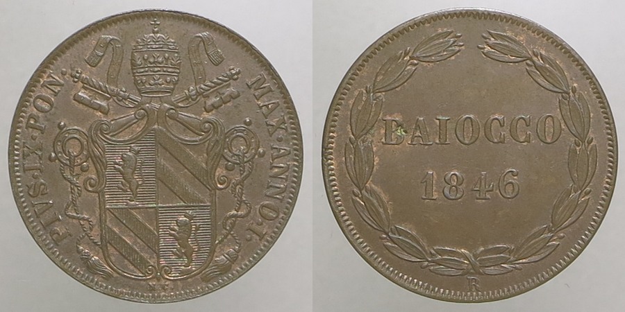 32. ROMA. Pio IX. Baiocco 1846-I. P.327. SPL+, lieve sfogliatura di metallo al R/., tracce di rame rosso...€.65,00.