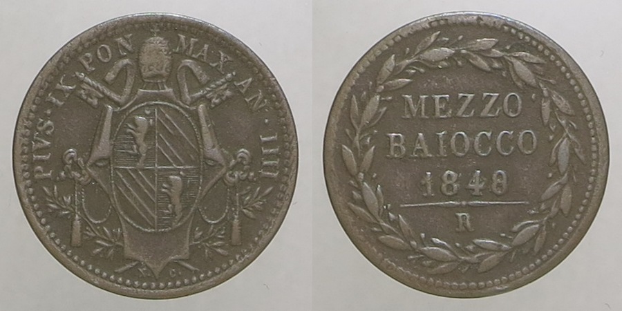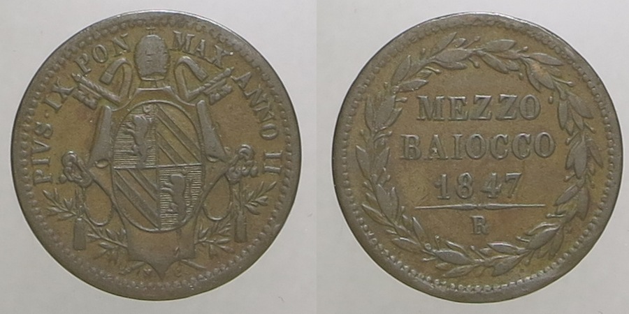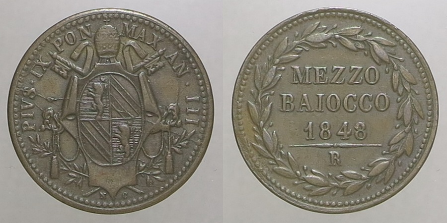 38. ROMA. Pio IX. Mezzo baiocco 1848-IIII (anacronismo). P.337. D’ Incerti 599 (R3). Muntoni 34c. BB+...RR.€.140,00.