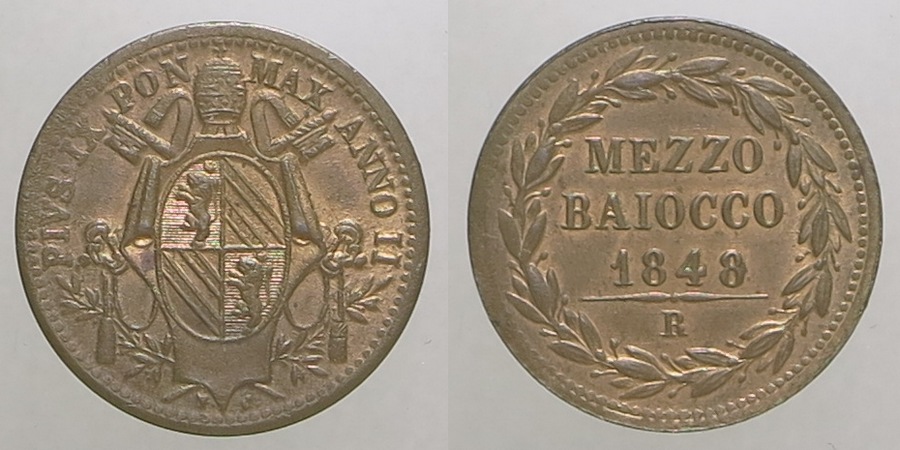 36. ROMA. Pio IX. Mezzo baiocco 1848-II. P.335. q.FdC, debolezza di conio al D/., abbondanti tracce di rame rosso...R.€.70,00.