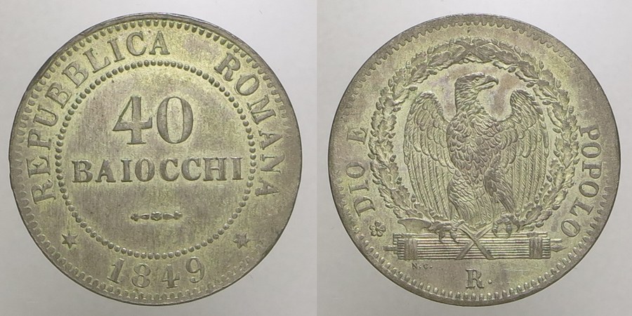 39. ROMA. II Repubblica romana (1848-49). 40 baiocchi 1849. P.339. SPL, lievi colpetti sui bordi, fondi in parte lucenti...R.€.300,00.