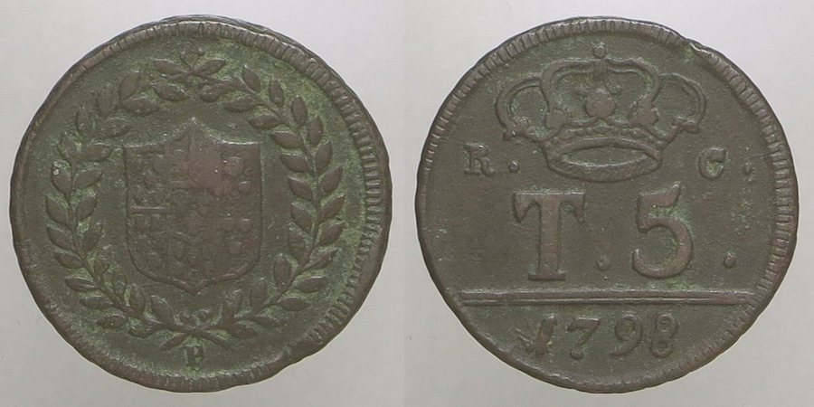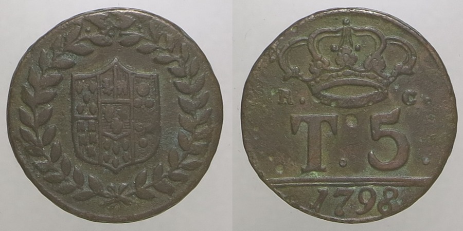 5. NAPOLI. Ferdinando IV. Cinque tornesi 1798 (senza la P sotto lo stemma al D/.). PR.101a. MIR.392/5. BB+/buon BB...RR.€.65,00.