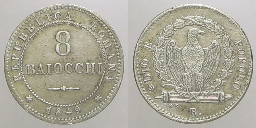 41. ROMA. II Repubblica romana. 8 baiocchi 1849. P.341. Ottimo BB...€.60,00.