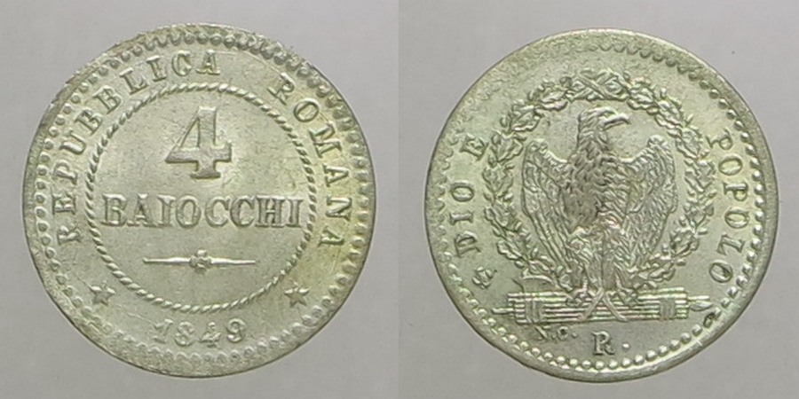 42. ROMA. II Repubblica romana. 4 baiocchi 1849. P.342. SPL+, fondi in parte lucenti...€.90,00.