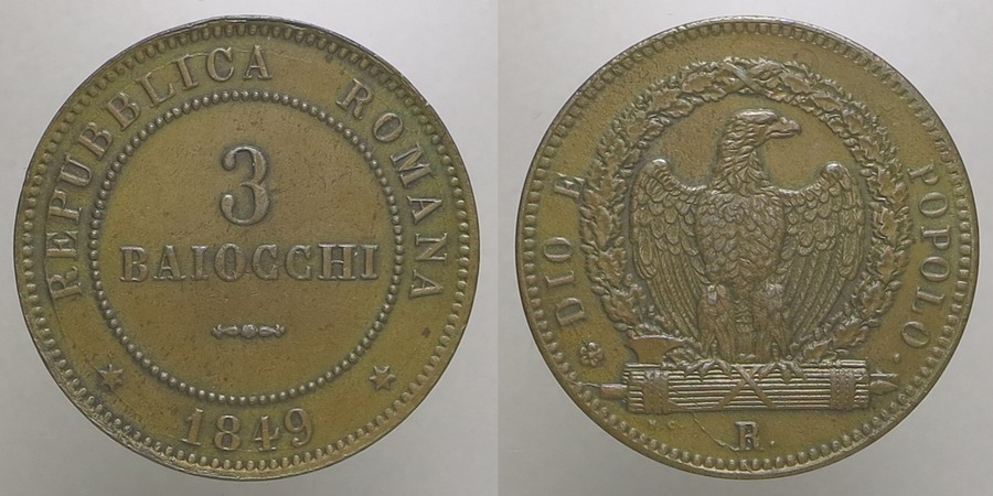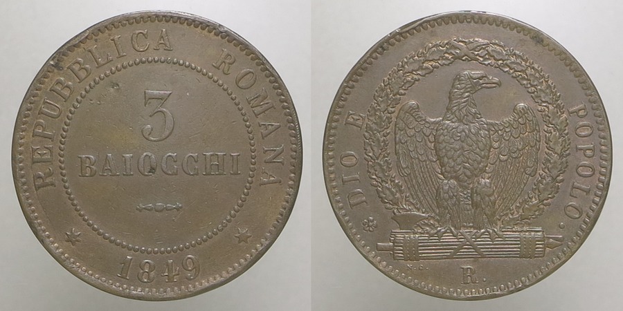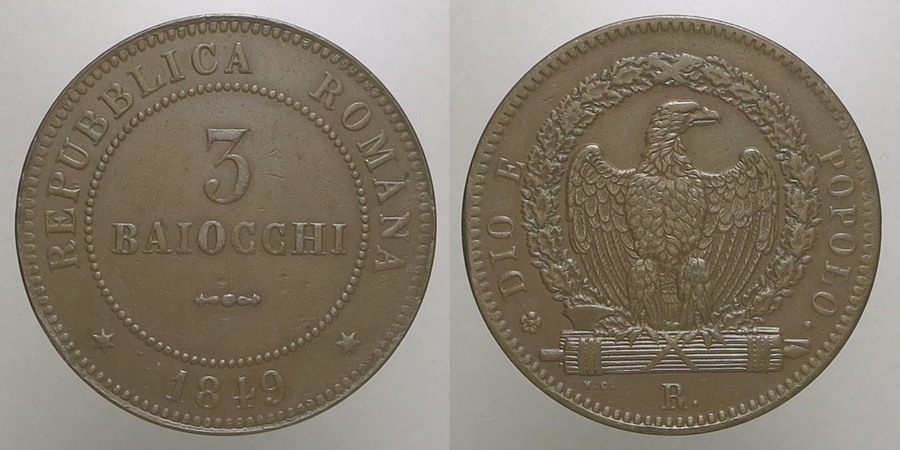 44. ROMA. II Repubblica romana. 3 baiocchi 1849. P.343a. q.SPL, colpetti sui bordi...€.50,00.