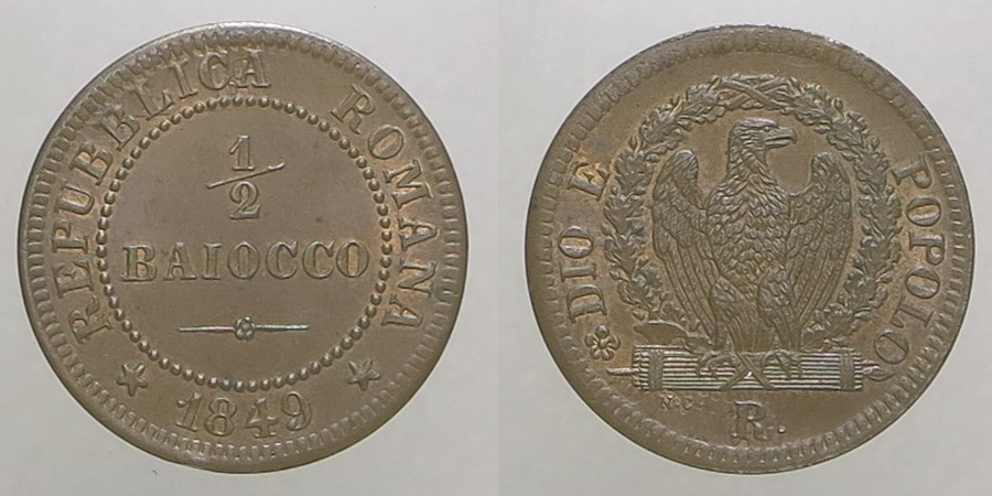 47. ROMA. II Repubblica romana. Mezzo baiocco 1849. P.345. Ottimo SPL, tracce di rame rosso...€.80,00.