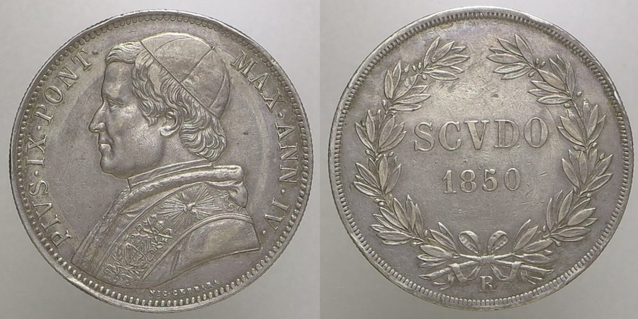 50. ROMA. Pio IX (1849-66, II periodo). Scudo 1850-IV. P.393. Ottimo BB/q.SPL, fondi lievemente puliti, lievissimi colpetti sui bordi...R.€.170,00.