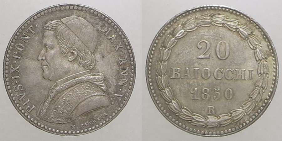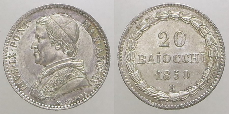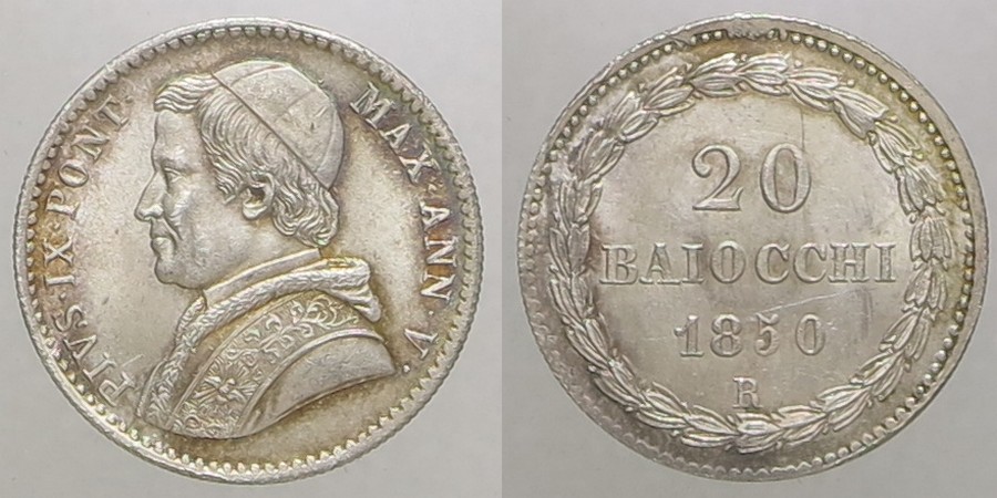 55. ROMA. Pio IX. 20 baiocchi 1850-IV. P.405. q.FdC, fondi lucenti, piacevole patina...€.70,00.