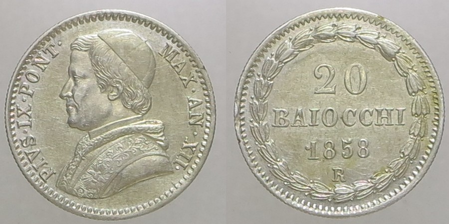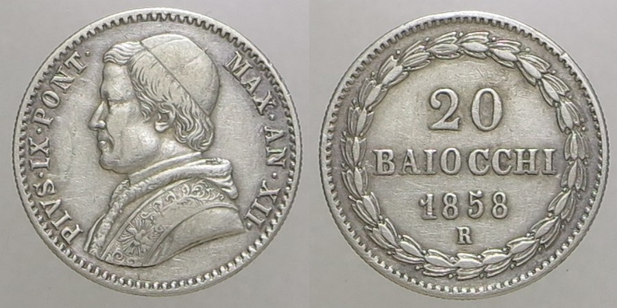 59. ROMA. Pio IX. 20 baiocchi 1858-XII (R più piccola). P.412 v. Gigante 90a. Buon BB...€.40,00.