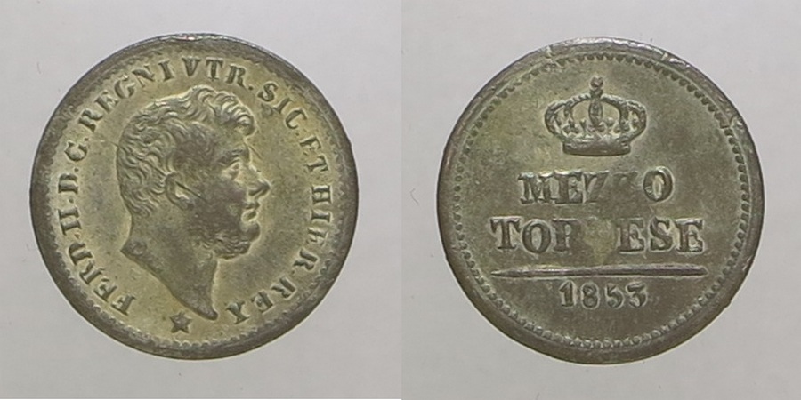 6. NAPOLI. Ferdinando II (1830-59). Mezzo tornese 1853 (argentato d’ epoca). P.476. q.SPL...€.75,00.