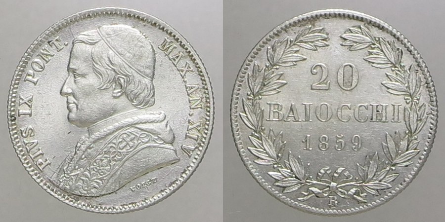 60. ROMA. Pio IX. 20 baiocchi 1859-XIV. P.415. Ottimo SPL...€.50,00.