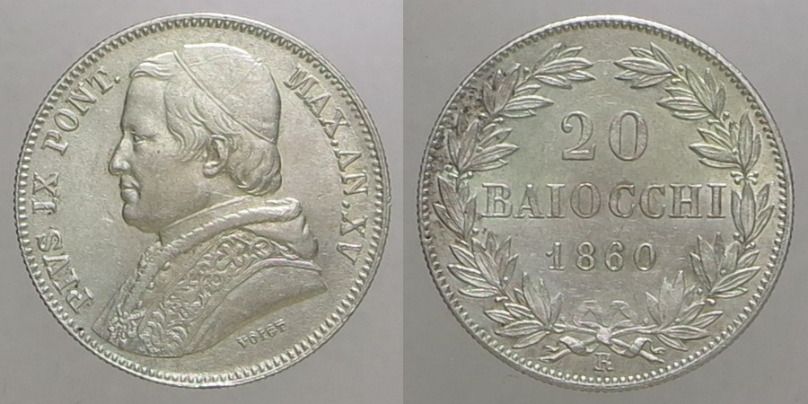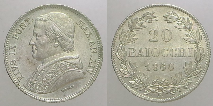 61. ROMA. Pio IX. 20 baiocchi 1860-XIV. P.416. Ottimo SPL...€.50,00.