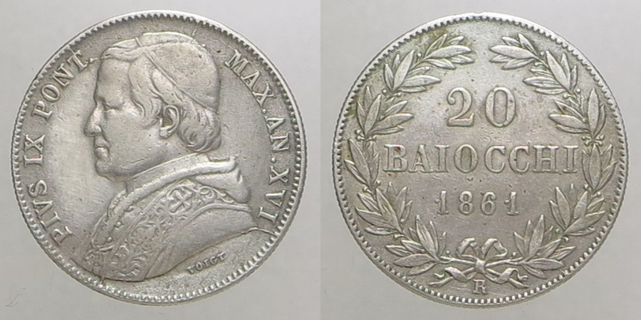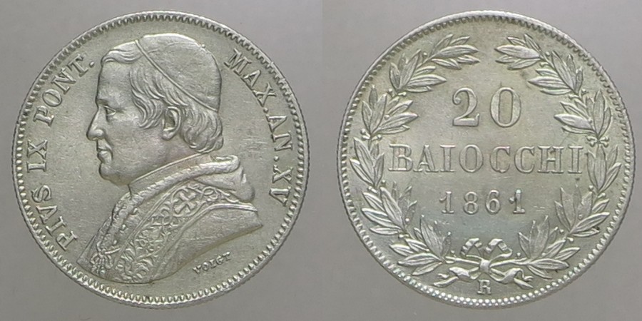 64. ROMA. Pio IX. 20 baiocchi 1861-XVI. P.419. q.BB/BB...€.35,00.