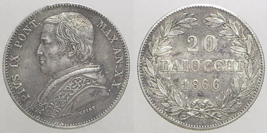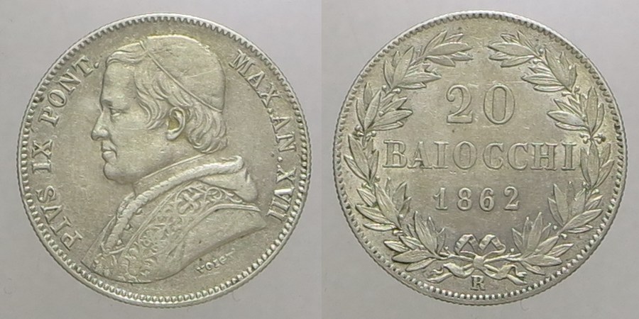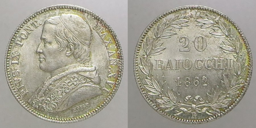 66. ROMA. Pio IX. 20 baiocchi 1862-XVII. P.421. q.SPL/SPL...€.40,00.