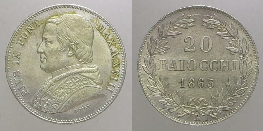 67. ROMA. Pio IX. 20 baiocchi 1863-XVIIII. P.423. q.FdC, fondi in parte lucenti...€.60,00.
