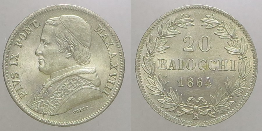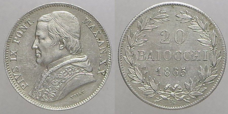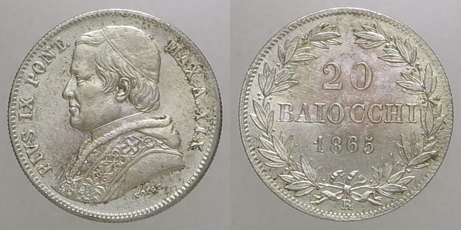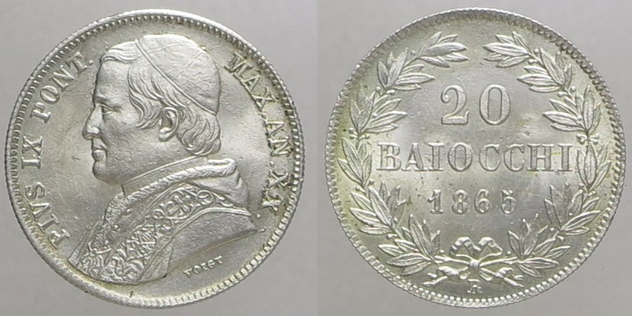 72. ROMA. Pio IX. 20 baiocchi 1865-XX. P.427a. q.FdC, fondi lucenti...€.50,00.