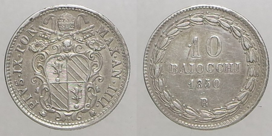 74. ROMA. Pio IX. 10 baiocchi 1850-IIII. P.431. q.SPL/ottimo BB...€.40,00.