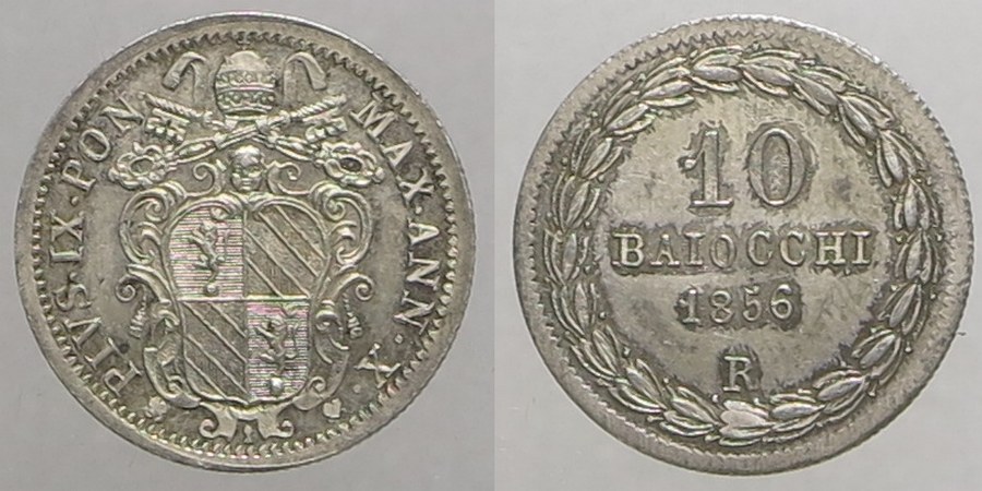 75. ROMA. Pio IX. 10 baiocchi 1856-X. P.437. q.FdC, piacevole patina su fondi lucenti...RR.€.150,00.