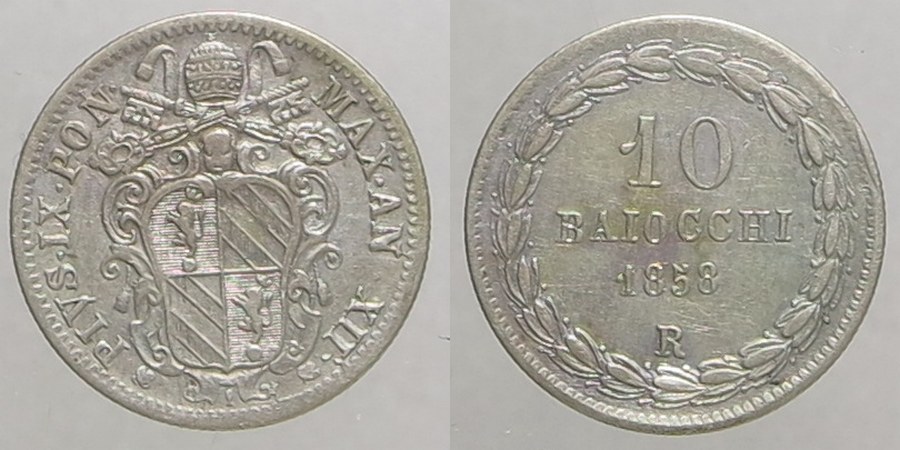 77. ROMA. Pio IX. 10 baiocchi 1858-XIII. P.439. Buon BB/BB...€.25,00.