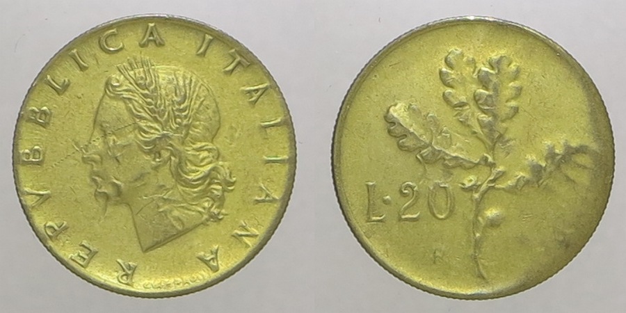8. REPUBBLICA ITALIANA (dal 1946). 20 lire data illeggibile. Peso gr.3,56. P. tipo 2251. q.BB, graffi al D/. (curiosità)...€.25,00.