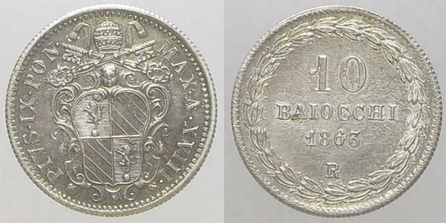 82. ROMA. Pio IX. 10 baiocchi 1863-XVIII. P.447. SPL, fondi lucenti...€.50,00.